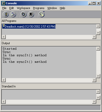 Một “deadlock” (sự bế tắt) xảy ra khi hai luồng có một phụ thuộc vòng quanh trên một cặp đối tượng đồng bộ; lấy ví dụ, khi một luồng thâm nhập vào monitor trên đối tượng “ObjA”, và một luồng khác thâm nhập vào monitor trên đối tượng “ObjB”. Nếu luồng trong “ObjA” cố gắng gọi phương thức đồng bộ trên “ObjB”, một bế tắt xảy ra.