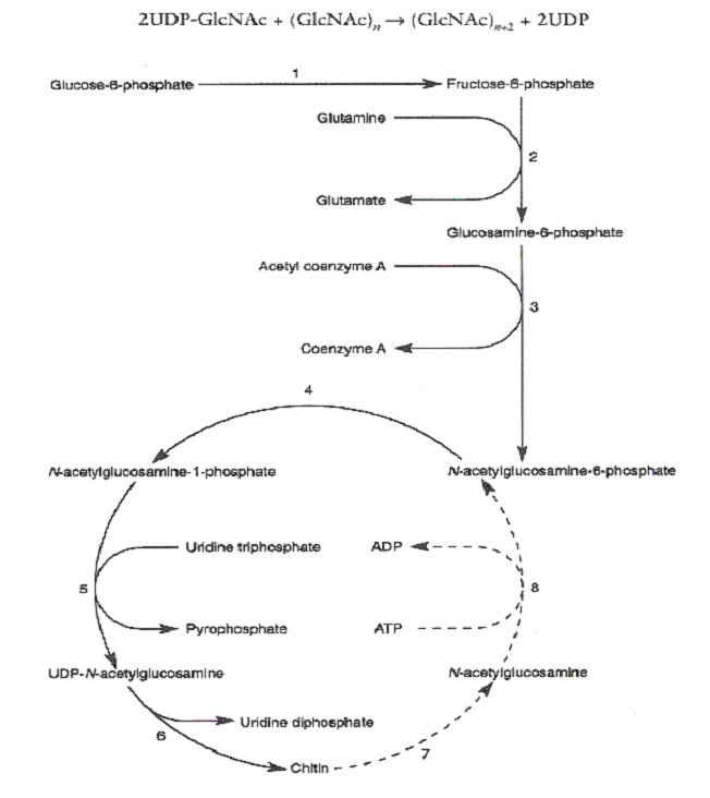 Vách tế bào nấm cấu tạo bởi vi sợi chitin và có hoặc không có celluloz. Chitin là thành phần chính của vách tế bào ở hầu hết các loài nấm trừ nhóm Oomycetina. Những vi sợi chitin được hình thành nhờ vào enzim chitin syntaz (Hình 1.4).