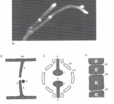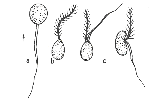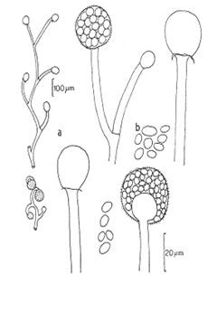 a. Bào tử túi (bào tử bọc)(sporangiospores): các bào tử động (zoospores) (Hình 1.5 a, b, c) có ở nấmSaprolegnia và bào tử túi (sporangiopores) ở nấm Mucor, Rhizopus (Hình 1.6) chứa trong túi bào tử động (zoosporangium) và túi bào tử (sporangium) được mang bỡi cuống túi bào tử(sporangiophores).