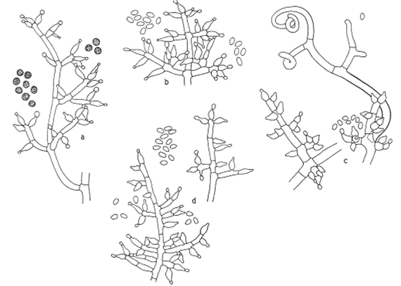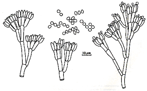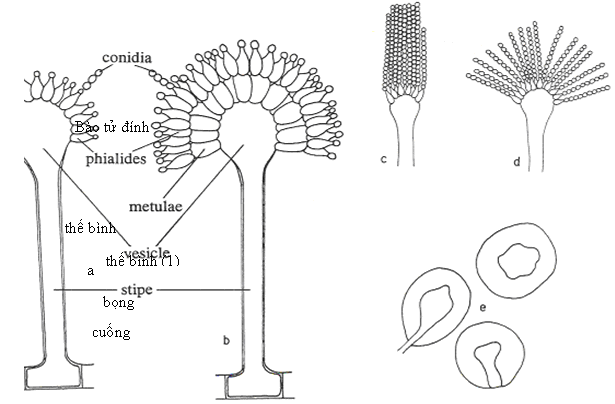 Cuống bào tử đính dạng bình có thể không phân nhánh như ở Aspergillus (Hình 1.7) hay dạng thẻ phân nhánh như ở Penicillium (Hình 1.8). Bào tử đính hình thành từ những cụm (cluster) trên những cuống bào tử đính ở Trichoderma (Hình 1.9).