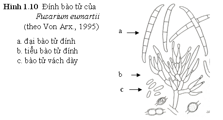 Ở giống Microsporum và Fusarium, có hai loại bào tử đính: loại nhỏ, đồng nhất gọi là tiểu bào tử đính (microconidia) (Hình 1.10 a) , loại lớn, đa dạng gọi là đại bào tử đính (macroconidia) (Hình 1.11 b)