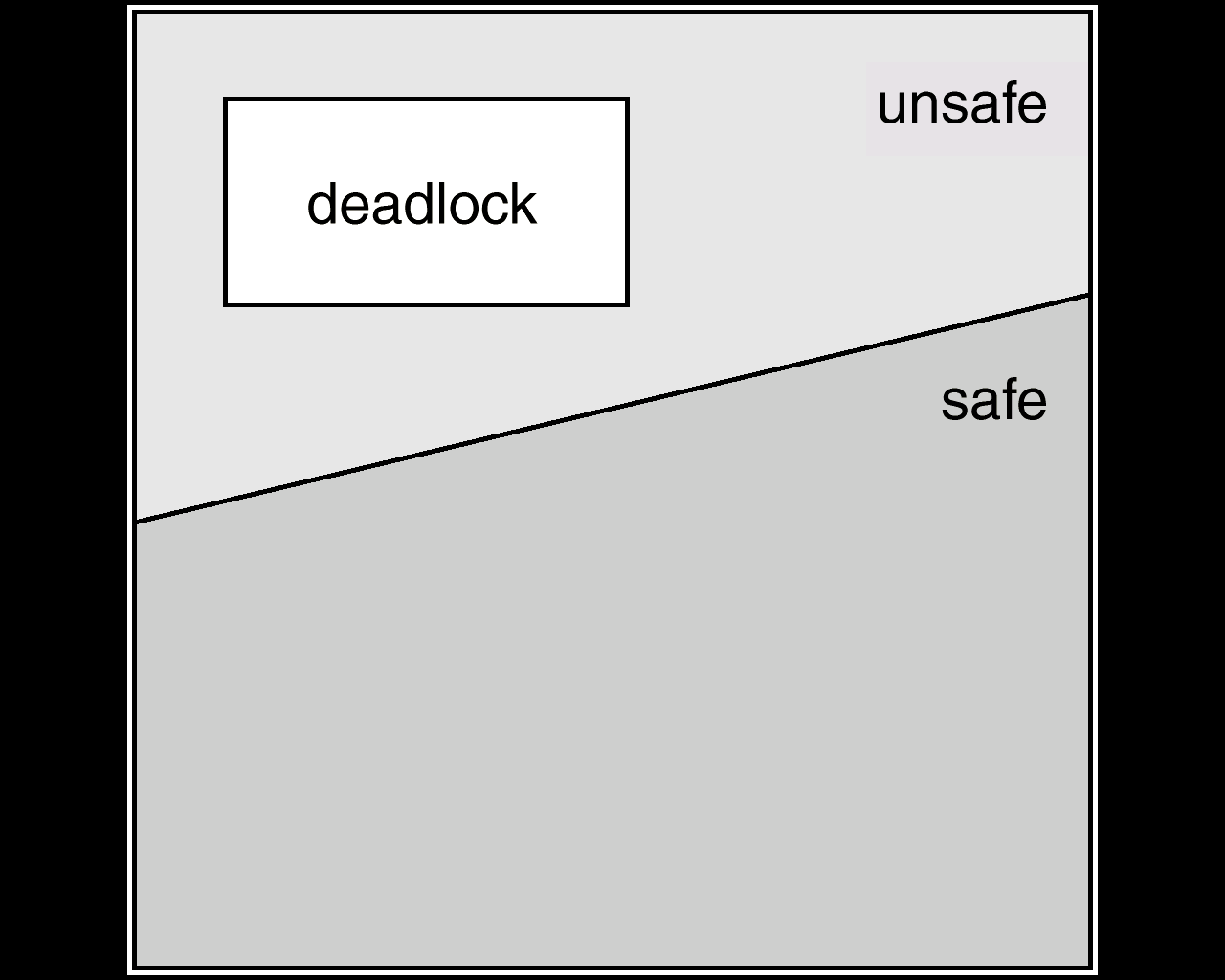 Một trạng thái an toàn không là trạng thái deadlock. Do đó, trạng thái deadlock là trạng thái không an toàn. Tuy nhiên, không phải tất cả trạng thái không an toàn là deadlock (hình VI-4). Một trạng thái không an toàn có thể dẫn đến deadlock. Với điều kiện trạng thái là an toàn, hệ điều hành có thể tránh trạng thái không an toàn (và deadlock). Trong một trạng thái không an toàn, hệ điều hành có thể ngăn chặn các quá trình từ những tài nguyên đang yêu cầu mà deadlock xảy ra: hành vi của các quá trình này điều khiển các trạng thái không an toàn.