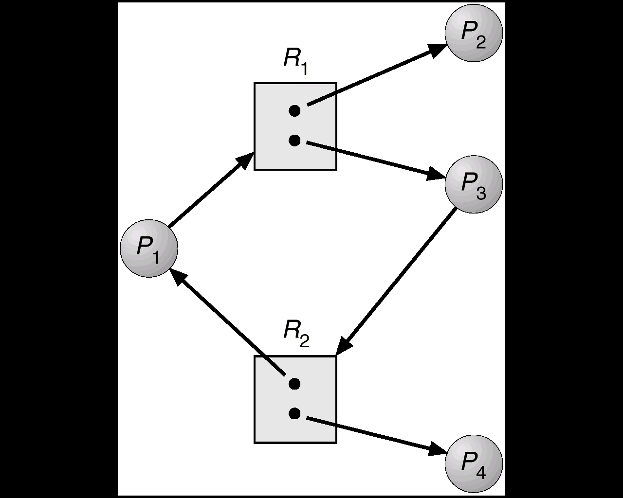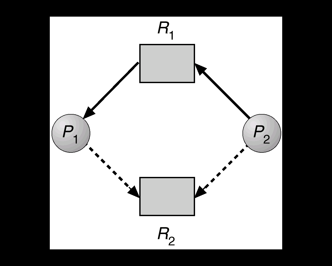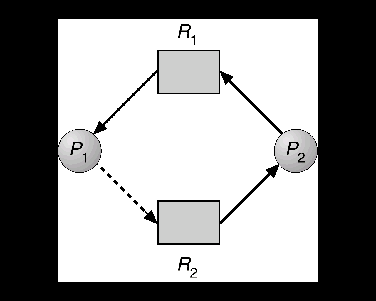 - Quá trình P1 đang giữ một thể hiện của loại tài nguyên R2 và đang chờ một thể hiện của loại tài nguyên R1.