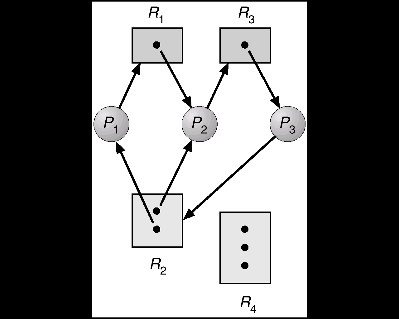 - Tồn tại chu trình trong đồ thị cấp phát tài nguyên: một tập hợp các quá trình {P0, P1,…,Pn} đang chờ mà trong đó P0 đang chờ một tài nguyên được giữ bởi P1, P1 đang chờ tài nguyên đang giữ bởi P2,…,Pn-1 đang chờ tài nguyên đang được giữ bởi quá trình P0.