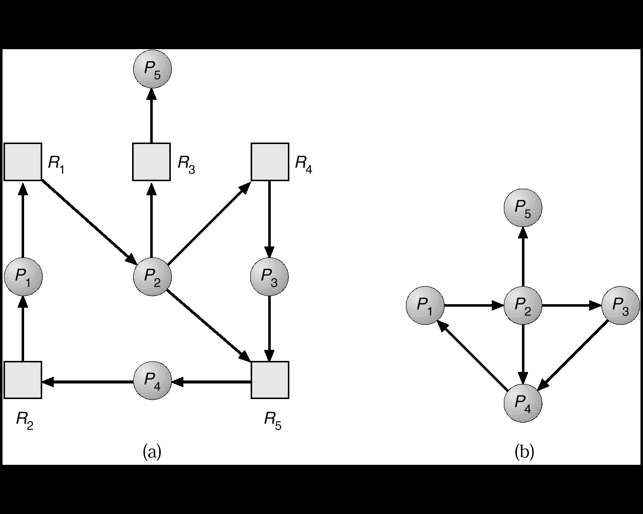 Chính xác hơn, một cạnh từ Pi tới Pj trong đồ thị chờ hiển thị rằng quá trình Pi đang chờ một quá trình Pj để giải phóng tài nguyên mà Pi cần. Cạnh Pi Pj tồn tại trong đồ thị chờ nếu và chỉ nếu đồ thị cấp phát tài nguyên tương ứng chứa hai cạnh Pi Rq và Rq Pj đối với một số tài nguyên Rq. Thí dụ, trong hình VI-7 dưới đây, chúng ta trình bày đồ thị cấp phát tài nguyên và đồ thị chờ tương ứng.