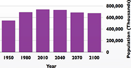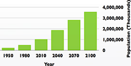 The United Nations Population Fund (2008) categorizes nations as high fertility, intermediate fertility, or low fertility. They anticipate the population growth to triple between 2011 and 2100 in high-fertility countries, which are currently concentrated in sub-Saharan Africa. For countries with intermediate fertility rates (the U.S., India, and Mexico all fall into this category), growth is expected to be about 26 percent. And low-fertility countries like China, Australia, and most of Europe will actually see population declines of approximately 20 percent. The graphs below illustrate this trend.