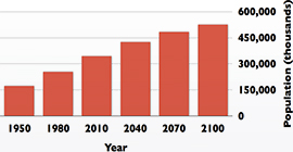 As mentioned earlier, the earth’s population is seven billion. That number might not seem particularly jarring on its own; after all, we all know there are lots of people around. But consider the fact that human population grew very slowly for most of our existence, then doubled in the span of half a century to reach six billion in 1999. And now, just over ten years later, we have added another billion. A look at the graph of projected population indicates that growth is not only going to continue, but it will continue at a rapid rate.
