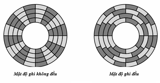 Với kỹ thuật ghi mật độ không đều, tất cả các rãnh đều có cùng một số cung, điều này làm cho các cung dài hơn ở các rãnh xa trục quay có mật độ ghi thông tin thấp hơn mật độ ghi trên các cung nằm gần trục quay.