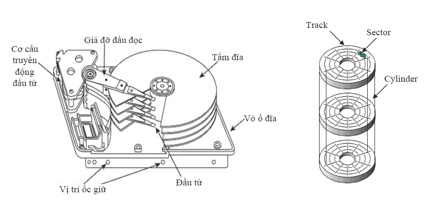 Một đĩa cứng chứa nhiều lớp đĩa (từ 1 đến 4) quay quanh một trục khoảng 3.600-15.000 vòng mỗi phút. Các lớp đĩa này được làm bằng kim loại với hai mặt được phủ một chất từ tính (hình V.1). Đường kính của đĩa thay đổi từ 1,3 inch đến 8 inch. Mỗi mặt của một lớp đĩa được chia thành nhiều đường tròn đồng trục gọi là rãnh. Thông thường mỗi mặt của một lớp đĩa có từ 10.000 đến gần 30.000 rãnh. Mỗi rãnh được chia thành nhiều cung (sector) dùng chứa thông tin. Một rãnh có thể chứa từ 64 đến 800 cung. Cung là đơn vị nhỏ nhất mà máy tính có thể đọc hoặc viết (thông thường khoảng 512 bytes). Chuỗi thông tin ghi trên mỗi cung gồm có: số thứ tự của cung, một khoảng trống, số liệu của cung đó bao gồm cả các mã sửa lỗi, một khoảng trống, số thứ tự của cung tiếp theo.