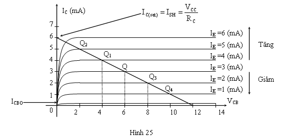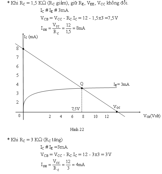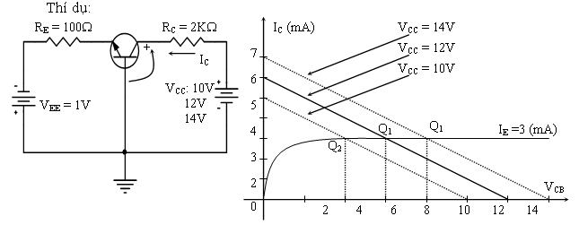 Như vậy, khi giữ các nguồn phân cực VCC, VEE và RE cố định, thay đổi RC, điểm điều hành Q sẽ chạy trên đặc tuyến tương ứng với IE = 3mA. Khi RC tăng thì VCB giảm và ngược lại.