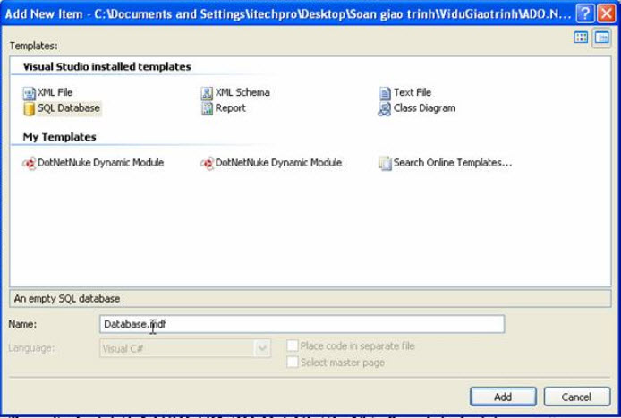 Bước 1. Nhấn chuột phải vào thư mục App_Data chọn new Item, Cửa sổ Add New Item hiện ra bạn chọn SqlDatabase như hình sau