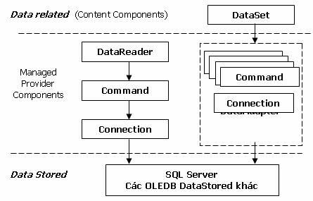 - Content Component: bao gồm các đối tượng như DataSet, DataTable,…đại diện cho dữ liệu thực sự cần làm việc. DataReader là đối tượng mới, giúp truy cập dữ liệu nhanh chóng nhưng forward-only và read-only giống như ADO RecordSet sử dụng Server cursor, OpenFowardOnly và LockReadOnly.