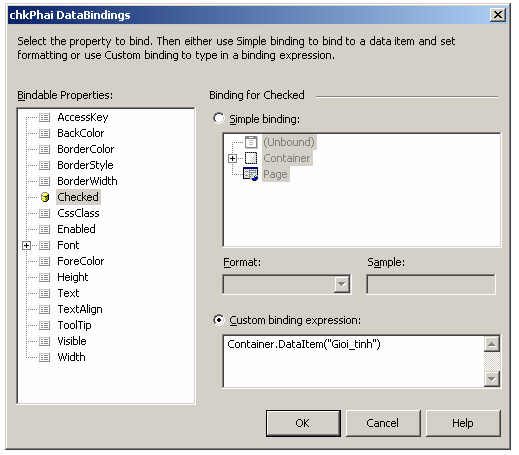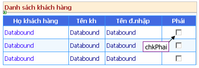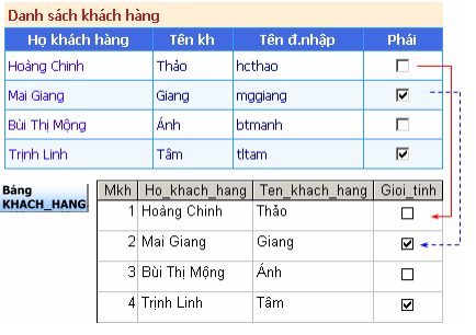 Ở ví dụ này, chúng ta thực hiện liên kết thuộc tính Checked của điều khiển chkPhai với field Gioi_tinh có trong nguồn dữ liệu của lưới.