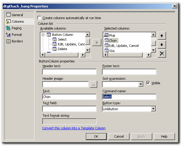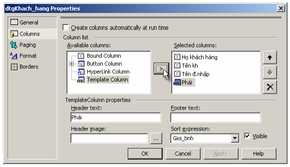 - Template Column: Cột do người dùng tự thiết kế. Đây là loại cột có khả năng làm việc khá linh hoạt.