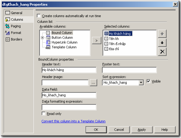 Create columns automatically at runtime: Khi chọn chức năng này, DataGrid sẽ tự động phát sinh đầy đủ các cột có trong nguồn dữ liệu. Nếu chúng ta muốn qui định các cột cần hiển thị, chúng ta không chọn chức năng này.