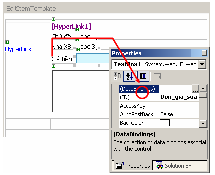 Thiết kế cả 2 vùng ItemTemplate và EditItemTemplate. Thực hiện các thao tác liên kết dữ liệu cho các điều khiển trong vùng EditItemTemplate thông qua cửa sổ thuộc tính tương tự như trong ItemTemplate.