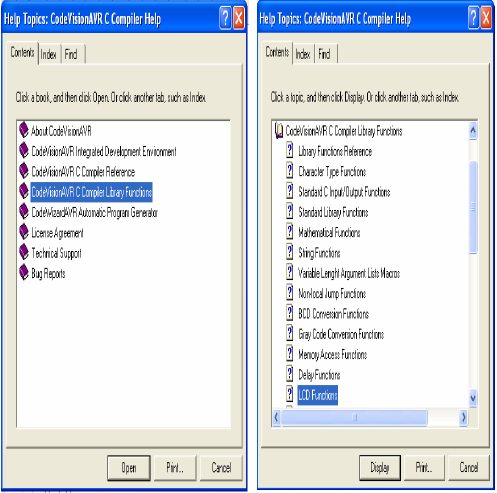 Trong tab Contents, click đúp chuột vào CodeVisionAVR C Compiller Library Functions được như bên cạnh. Nhấp đúp vào LCD Functions để tham khảo các hàm cho LCD.