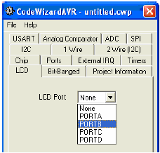 Trong cửa sổ CodeWinzard, chọn tab LCD, trong list mặc định là None, các bạn chuyển thành PORTB cho phù hợp với phần cứng của KIT( thiết kế LCD ở PORTB). Chọn File → Generate, Save and Exit được như sau: