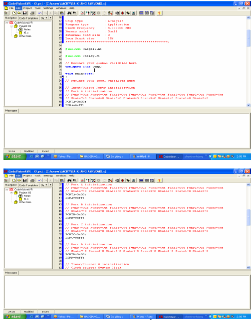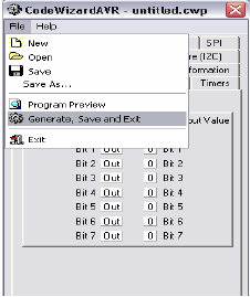 Các chân IO của AVR mặc định trạng thái IN, muốn chuyển thành trạng thái OUT để có thể đưa các mức logic ra ta click chuột vào các nút IN (mầu trắng) để nó chuyển thành OUT trong các Tab Port. Sau đó chọn File → Generate, Save and Exit.
