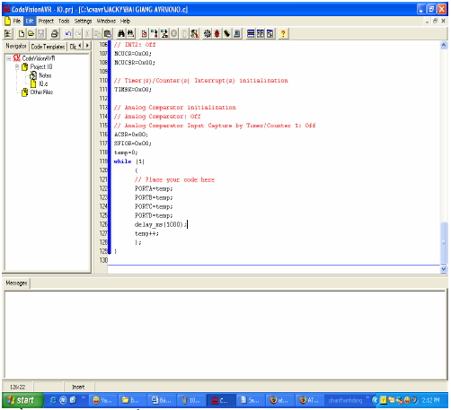 #include <delay.h>. Để led nhấp nháy ở cổng IO ta đưa ra cổng IO một biến temp có giá trị tăng dần từ 0 đến 255. Do đó ta khai báo thêm một biến unsigned char temp ngay dưới dòng // Declare your global variables here như sau: