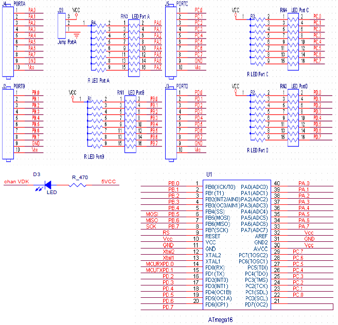 Các led đơn nối với các cổng vào ra của ATMEGA16L(PORTA-PORTB-PORTC-PORTD). Để led sáng cần đưa mức logic của các chân IO của AVR lên mức cao(5V), để led tắt đưa các chân IO của AVR xuống mức thấp.