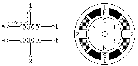 Động cơ bước đơn cực, ( có thể là động cơ vĩnh cửu hoặc động cơ hỗn hợp ) có 5,6 hoặc 8 dây ra thường được quấn như sơ đồ dưới. Khi dùng, các đầu nối trung tâm thường được nối vào cực dương nguồn cấp, và hai đầu còn lại của mỗi mấu lần lượt nối đất để đảo chiều từ trường tạo bởi quận đó.