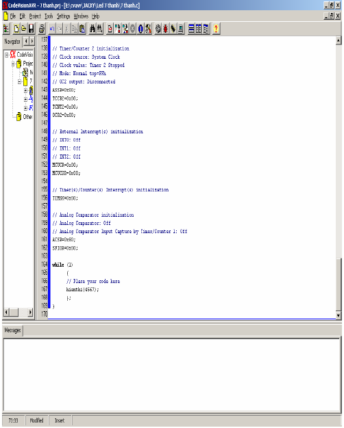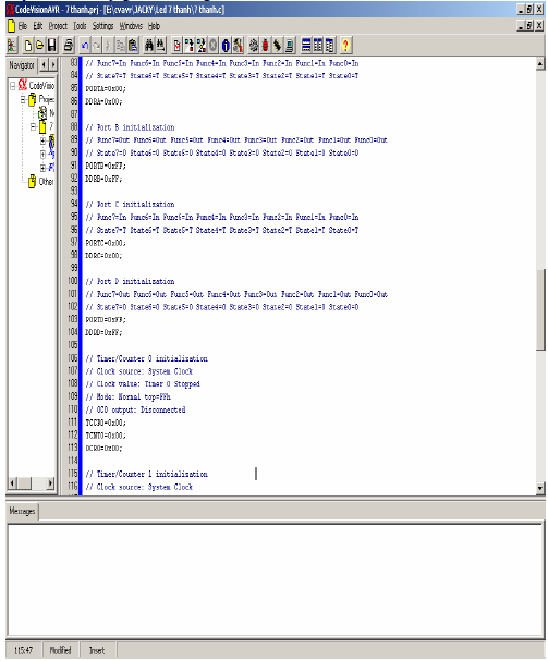 Trong bài này vì nếu đưa các PORTD và PORTB lúc khởi tạo bằng 0x00 thì tất cả các led sẽ sáng do đó tại các câu lệnh khởi tạo cho hai PORT này các bạn hãy gán cho nó giá trị 0xFF như hình sau: