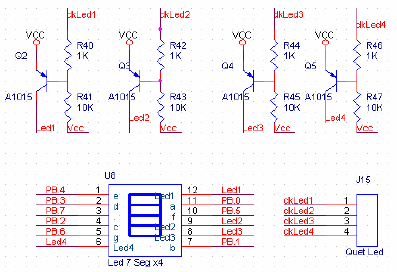 4 led 7 thanh anot chung, 4 chân anot chung(chân dương) được nối với 4 transitor để ta có thể quét led sử dụng 4 chân của PORTD, các chân điều khiển sáng các thanh còn lại được nối song song nhau và đưa vào PORTB của AVR và có thứ tự như sau: Từ bít 0 → 6 ứng với từ A → G. Bít thứ 7 là dấu chấm.