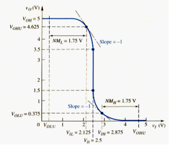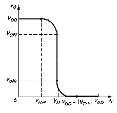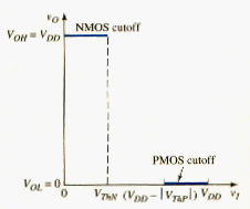 [link] shows the voltage transfer characteristics generated thus far for the CMOS inverter. The more positive output voltage corresponds to a logic 1, or , and the more negative output voltage corresponds to a logic 0, or . When the output is in the logic 1 state, the NMOS transistor is cut off; when the output is in the logic 0 state, the PMOS transistor is cut off.