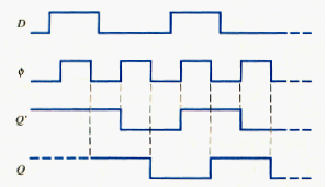 The circuit shown in [link] is a master-slave configuration of a D flip-flop. When clock pulse is high, transmission gate TG1 is conducting and data D goes through the first inverter, which means that . Transmission gate TG2 is off, so data stops at Q’. When clock pulse goes low, then TG3 turns on, and the master portion of flip-flop is a static configuration. Also when goes low, TG2 turns on, the data are transmitted through the slave portion of the flip-flop, and the output is Q = = D. the data present when is high are transmitted to the output of the flip-flop during the negative transition of the clock pulse. The various signals in the D flip-flop are shown in [link].