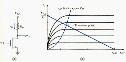 [link]a shows a single NMOS transistor connected to a resistor to form an inverter. The transistor characteristics and load line are shown in [link]b, along with the parametric curve separating the saturation and nonsaturation regions. We determine the voltage transfer characteristics of the inverter by examining the various regions in which the transistor can be biased.
