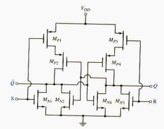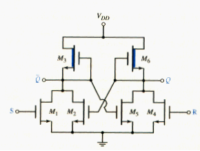 Flip-flops are bistable circuits usually formed by cross-coupling two NOR gates. [link] shown an R-S flip-flop using NMOS NOR logic gates with depletion loads. As shown, , , and form one NOR gate, and , , and form the second. The outputs of the two NOR circuits are connected back to the inputs of the opposite NOR gates.