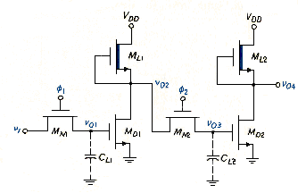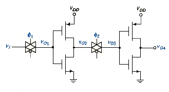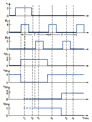 At t = , = 0, and = 5V, so that = 0 and = 5 V. Since = 0, MN2 is cut off, and and are isolated. At t = , = 5 V, so that charges to , and goes low (logic 0). At t = , both NMOS transmission gates are cut off, and the two inverters remain in their previous states. It is important that and do not overlap, or the signal would propagate through the whole chain at once and we would no longer have a shift register.
