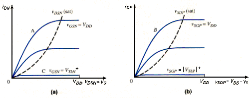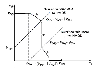 [link] shows the transistor characteristics for both the n- and p-channel devices. We can determine the voltage transfer characteristics of the inverter by evaluating the various transistor bias regions. For , the NMOS device is cut off, , and . The PMOS source-to-gate voltage is which means that the PMOS is biased on the curve marked B in [link]b. Since the only point on the curve corresponding to occurs at , the output voltage is . This condition exists as long as the NMOS transistor is cut off, or .
