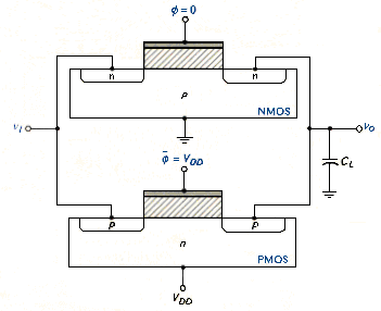 Using a CMOS transmission gate in a MOS circuit may introduce a dynamic condition. [link] shows the CMOS transmission gate with simplified cross sections of the NMOS and PMOS transistors. If = 0 and , then the input and output are isolated. If , then the NMOS substrate-to-terminal b pn junction is reverse biased and capacitance can discharge, as it did in the NMOS transmission gate. If, however, = 0, then the PMOS terminal c-to-substrate pn junction is reversed bias and capacitance can charge to a positive voltage. This circuit is therefore dynamic in that the output high or low conditions do not remain constant with time.