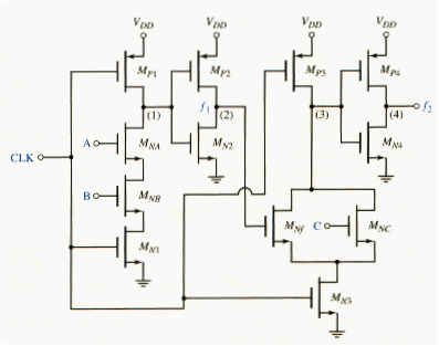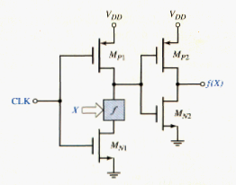 The set of X inputs to the logic circuit f is derived from the outputs of other CMOS inverters and clocked logic circuits. This means that when CLK = logic 0, the outputs of all n-variables X = ( , , .... ) are a logic 0 during the precharge cycle. During this time, all NMOS transistors are cut off, which guarantees that output can be precharged to . There can be only one possible transition at each node during the evaluation phase. The output of the CMOS buffer may change from a 0 to 1.