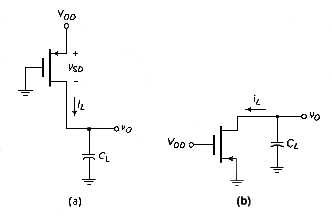 If , , , and is initially zero, then for the NMOS device, terminal a acts as the drain and terminal b acts as the source, whereas for the PMOS device, terminal c acts as the drain and terminal d acts as the source. Current enters the NMOS drain and the PMOS the PMOS source, as shown in [link]a, to charge the load capacitor. The NMOS gate-to-source voltage is