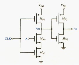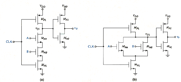 The CMOS NOR and NAND logic gates presented in the last section are called static circuits because periodic clock signals are not used. In practice, all systems employing sequential logic require clock signal for proper synchronized operation. Static CMOS NOR and NAND gates can be redesigned with an added clocked signal to eliminate many of the PMOS devices, while maintaining the low-power CMOS characteristics. In general, PMOS devices must be larger than NMOS transistors. Eliminating as many PMOS devices as possible reduces the required chip area as well as the input capacitance.