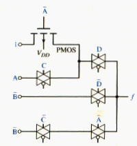 CMOS transmission gate may also be used in pass network logic design. CMOS pass networks use NMOS transistors to pass 0’s, PMOS transistors to pass 1’s and CMOS transmission gates to pass a variable to the output. An example is shown in [link]. One PMOS transistor is used to transmit a logic 1, while transmission gates are used to transmit a variable that may be either a logic 1 or a logic 0. We can show that for any combination of signals, a logic 1 or logic 0 is definitely passed to the output.