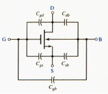 Since the MOS transistor is a majority carrier device, the switching speed of MOS digital circuits is limited by the time required to charge or discharge the capacitances between device electrodes and between interconnect lines and ground. [link] shows the significant capacitances in a MOSFET. The capacitances and are the source-to-body and drain-to-body p junction capacitances. The total input gate capacitance, to a first approximation, is a constant equal to
