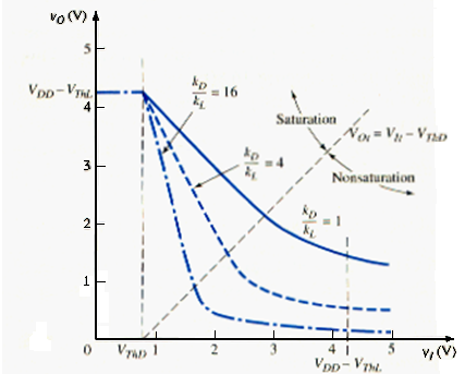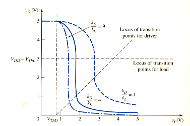 [link] shows the voltage transfer characteristics of this inverter for three -to- ratios. The ratio is the aspect ratio and is related to the width-to-length parameters of the driver and load transistors.