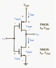 The CMOS inverter, shown in [link], is a series combination of a p-channel and an n-channel MOSFET. The gates of the two MOSFETs are connected together to form the input and the two drains are connected together to form the output. Both transistors are enhancement-mode devices. The parameters of the NMOS are denoted by and , where > 0, and the parameters of the PMOS are denoted by and , where < 0.