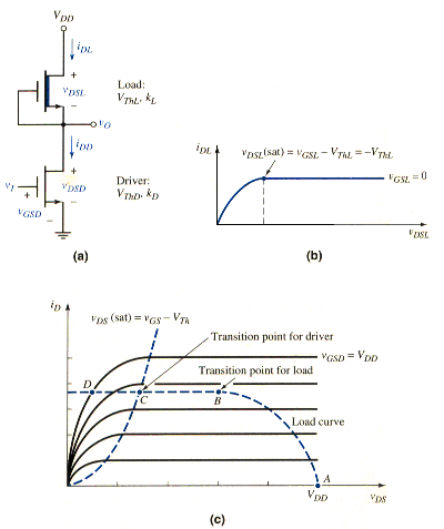 [link]a shows an NMOS inverter with the enhancement load device. The driver transistor parameters are denoted by and . The substrate connections are not shown. In the following analysis, we neglect the body effect and we assume all threshold voltages are constant. These assumptions do not seriously affect the basic analysis or the inverter characteristics.