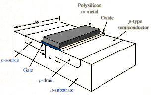 A simplified n-channel MOSFET is shown in [link]. The body or substrate, is a single crystal silicon wafer which is the starting material for circuit fabrication and provides physical support for the integrated circuit. The active transistor region is the surface of the semiconductor and is comprised of the heavy doped source and drain regions and p-type channel region. The channel length is L and the channel width is W. normally, in any given fabrication process, the channel length is the same for all transistors, while the channel width is variable.