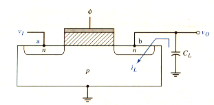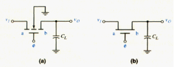 The NMOS enhancement-mode transistor shown in [link]a is a transmission gate connected to a load capacitance , which could be the input gate capacitance of a MOS logic circuit. In this circuit, the transistor must be bilateral, which means it must be able to conduct current in either direction. This is a natural feature of MOSFETs. Terminals a and b are assumed to be equivalent, and the bias applied to the transistor determines which terminal acts as the drain and which terminal acts as the source. The substrate must be connected to the most negative potential in the circuit, which is usually ground. [link]b shows a simplified circuit symbol for the NMOS transmission gate that is used extensively.