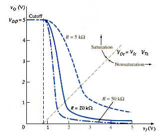 [link] shows the voltage transfer characteristics of this inverter for three resistor values. Also shown is the line, given by [link], which separates the saturation and nonsaturation bias region of the transistor. The figure shows that the minimum output voltage, or the logic 0 level, for a high input decreases with increasing load resistance, and the sharpness of the transition region between a low input and a high input increases with increasing load resistance.