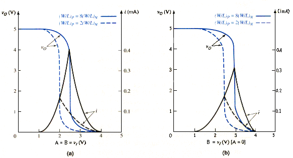 [link]b shows the transfer characteristics for input A held low and input B varied from zero to . This corresponds to only one input changing states while the other input remains constant. In this case, transistor is on and transistor is cut off. The resulting circuit is essentially equivalent to a simple CMOS inverter. When the width-to-length ratios of the PMOS devices are twice as large as those of the NMOS devices, the transfer characteristics are almost symmetrical, as we would expect for the CMOS inverter. When the PMOS width-to-length ratios are increased, the voltage transfer characteristic is no longer symmetrical. However, the maximum current is larger since the PMOS devices are lager, and this shortens the switching times. These results shown that we obtain good transfer characteristics when for the two-input CMOS NOR circuit.