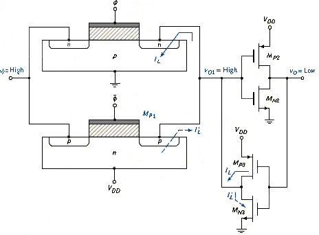 Similarly, when is low and is high, the pn junction in the transmission gate transistor is reverse-biased and transistor is biased on. Transistor sinks the pn junction leakage current , and the circuit remains in this static condition until charged by a new input signal through the transmission gate.