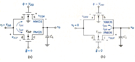 Consider what happens if , and initially. For the NMOS device, terminal a acts as the source and terminal b acts as the drain, whereas for the PMOS device, terminal c acts as source and terminal d acts as the drain. Current enters the NMOS drain and the PMOS source, as shown in [link]b, to discharge the capacitor. The NMOS gate-to-source voltage is