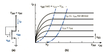 An n-channel enhancement-mode MOSFET with the gate connected to the drain can be used as a load device in an NMOS inverter. [link]a shows such a device. For , the drain current is zero. For , a nonzero drain current is induced in the device. We can see that the following condition is satisfied: